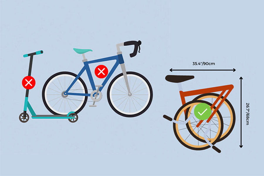 Bicycles & e-scooters are not accepted. Only foldable bikes, including foldable e-bikes, with a frame 90x68x40cm and 20" wheel, can be stored onboard.